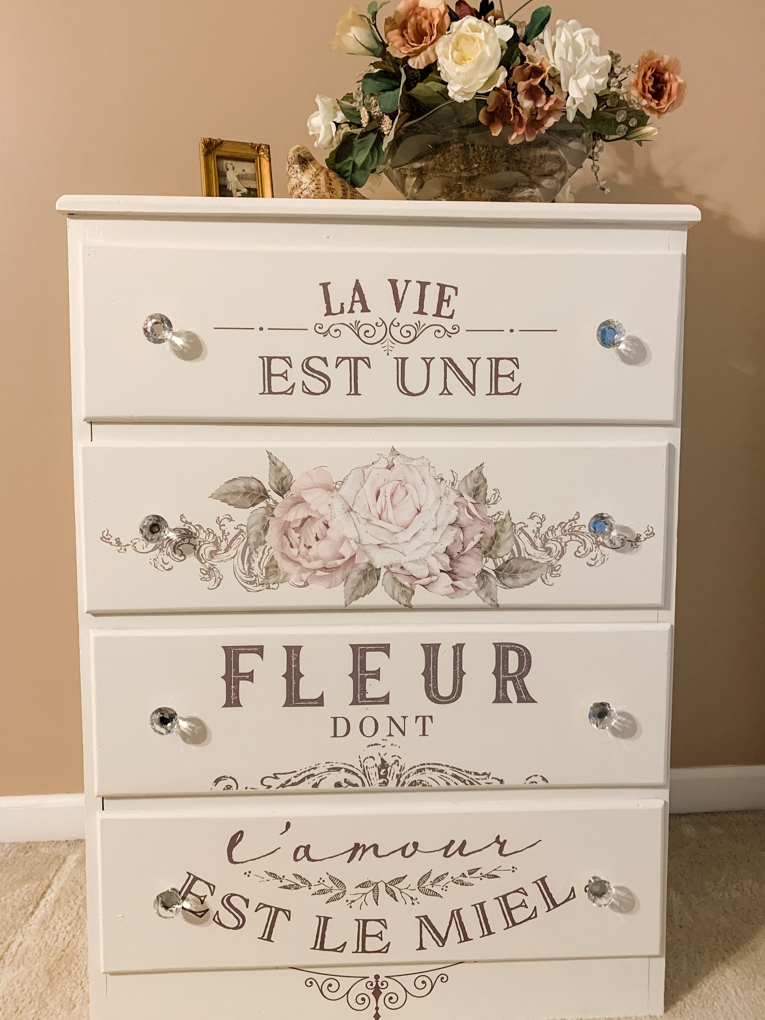 Before starting any good project, I always fall down the rabbit hole of checking out every similar project on Pinterest.  Just painting the dresser was not going to be enough to make me happy!  After a lot of searching on Amazon, I ordered a rub-on for the front, new pulls, and liners for the drawers.